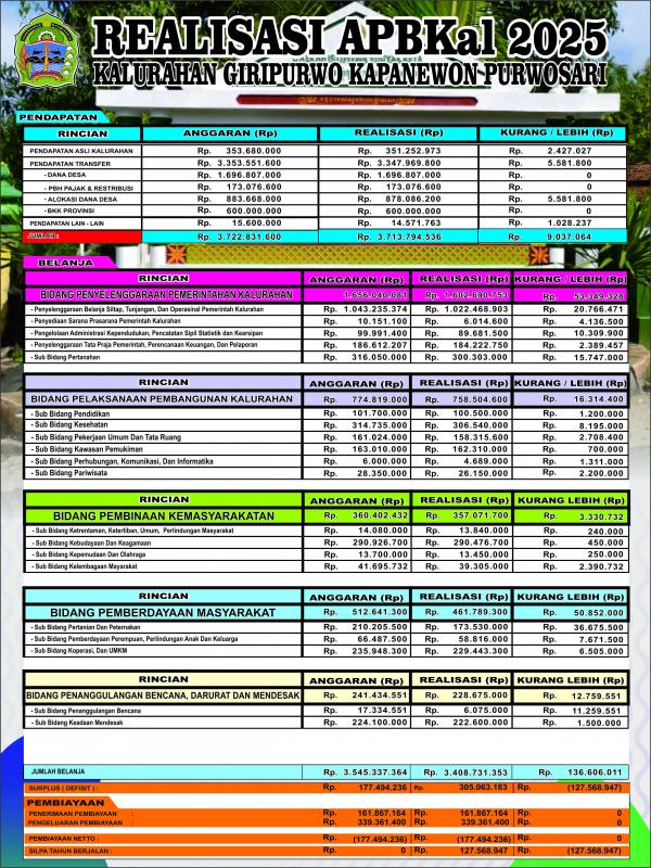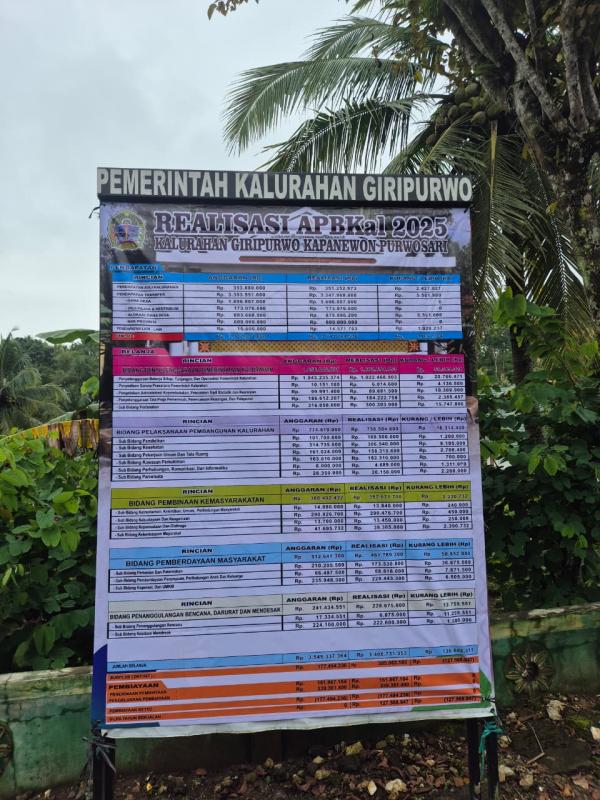 GIRIPURWO (SIDA)-- Dalam melaksanakan setiap kegiatan dalam pemerintahan, anggaran adalah bagian penting yang mendukung terlaksanaya kegiatan. Keseluruhan Realisasi anggaran di Kalurahan Giripurwo dimuat dalam Peraturan Kalurahan tentang Realisasi Anggaran Pendapatan dan Belanja Kalurahan Tahun Anggran 2025. Sebagai bentuk Transparansi Pemerintah Kalurahan Giripurwo maka dipublikasikan Realisasi Anggaran Pendapatan dan Belanja Kalurahan untuk Tahun Anggaran 2025 dengan memasang baliho di depan balai kalurahan serta di media sosial.